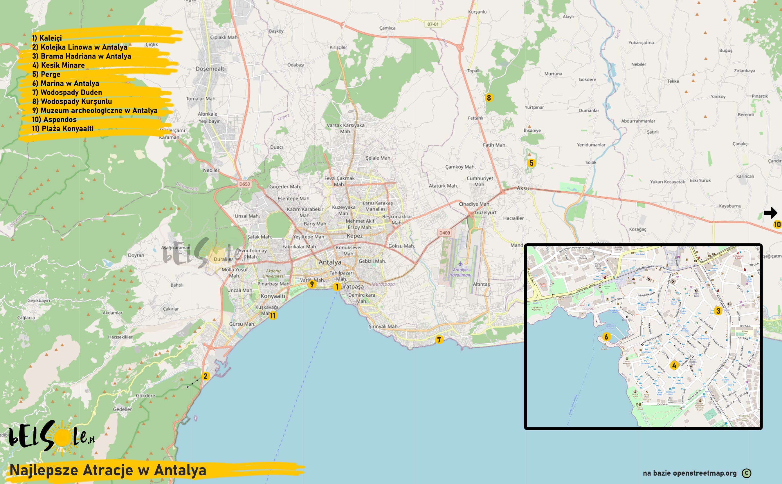 Oto lista atrakcji, które warto zobaczyć w Antalya w 2024: 1) Kaleiçi 2) Kolejka Linowa w Antalya 3) Brama Hadriana w Antalya 4) Kesik Minare 5) Perge 6) Marina w Antalya 7) Wodospady Duden 8) Wodospady Kurşunlu 9) Muzeum archeologiczne w Antalya 10) Aspendos 11) Plaża Konyaalti