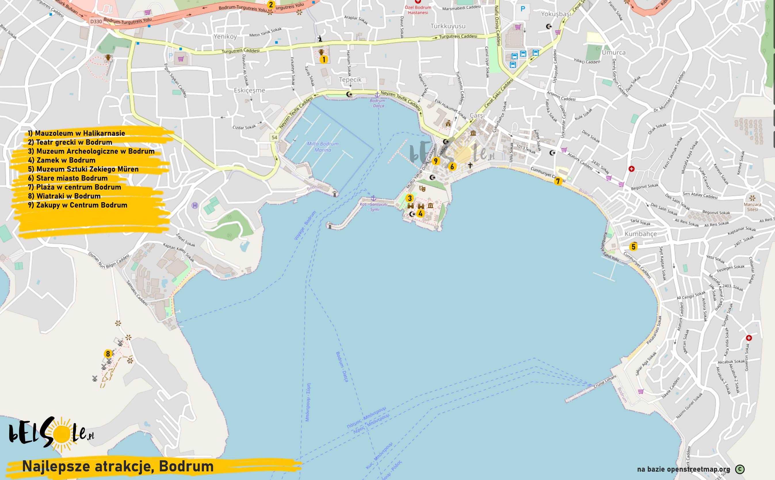 1) Mauzoleum w Halikarnasie 2) Teatr grecki w Bodrum 3) Muzeum Archeologiczne w Bodrum 4) Zamek w Bodrum 5) Muzeum Sztuki Zekiego Müren 6) Stare miasto Bodrum 7) Plaża w centrum Bodrum 8) Wiatraki w Bodrum 9) Zakupy w Centrum Bodrum