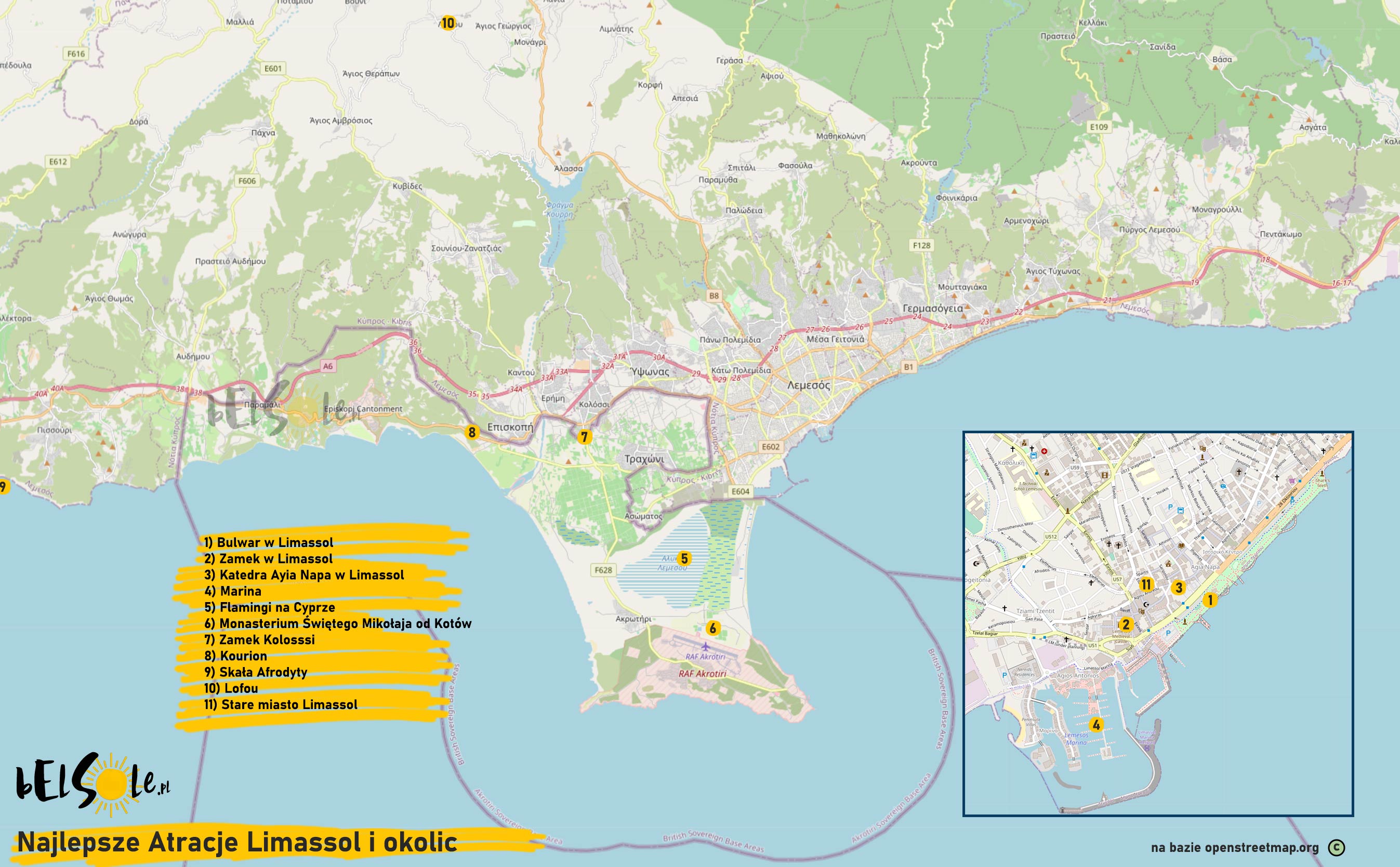 1) Bulwar w Limassol 2) Zamek w Limassol 3) Katedra Ayia Napa w Limassol 4) Marina 5) Flamingi na Cyprze 6) Monasterium Świętego Mikołaja od Kotów 7) Zamek Kolosssi 8) Kourion 9) Skała Afrodyty 10) Lofou 11) Stare miasto Limassol