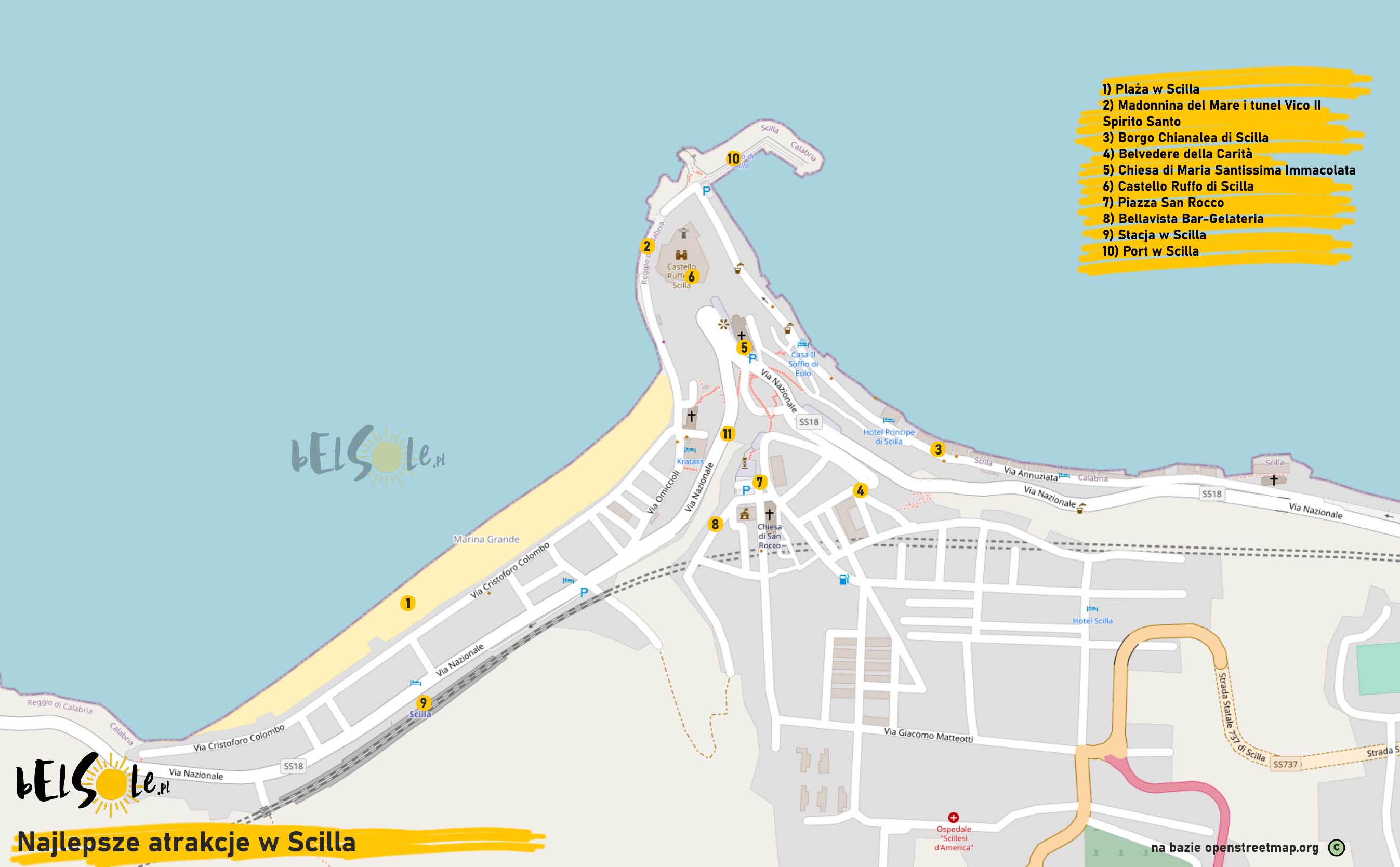 1) Plaża w Scilla 2) Madonnina del Mare i tunel Vico II Spirito Santo 3) Borgo Chianalea di Scilla 4) Belvedere della Carità 5) Chiesa di Maria Santissima Immacolata 6) Castello Ruffo di Scilla 7) Piazza San Rocco 8) Bellavista Bar-Gelateria 9) Stacja w Scilla 10) Port w Scilla