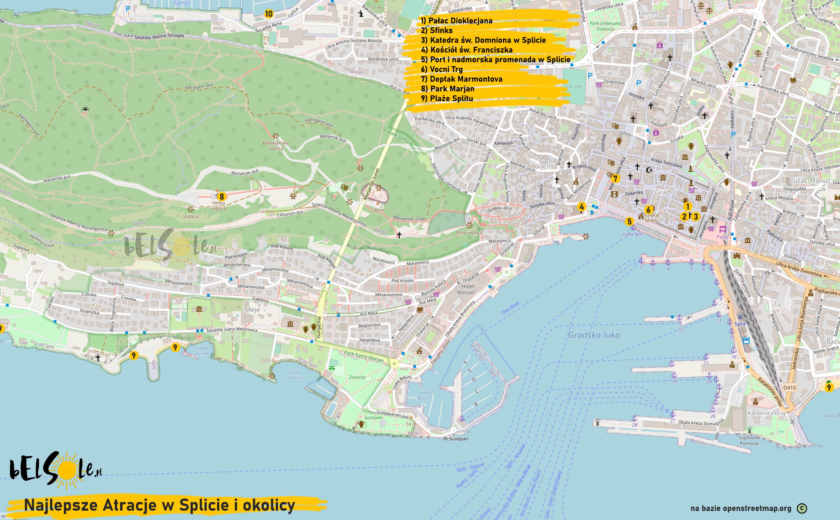 1) Pałac Dioklecjana 2) Sfinks 3) Katedra św. Domniona w Splicie 4) Kościół św. Franciszka 5) Port i nadmorska promenada w Splicie 6) Vocni Trg 7) Deptak Marmontova 8) Park Marjan 9) Plaże Splitu