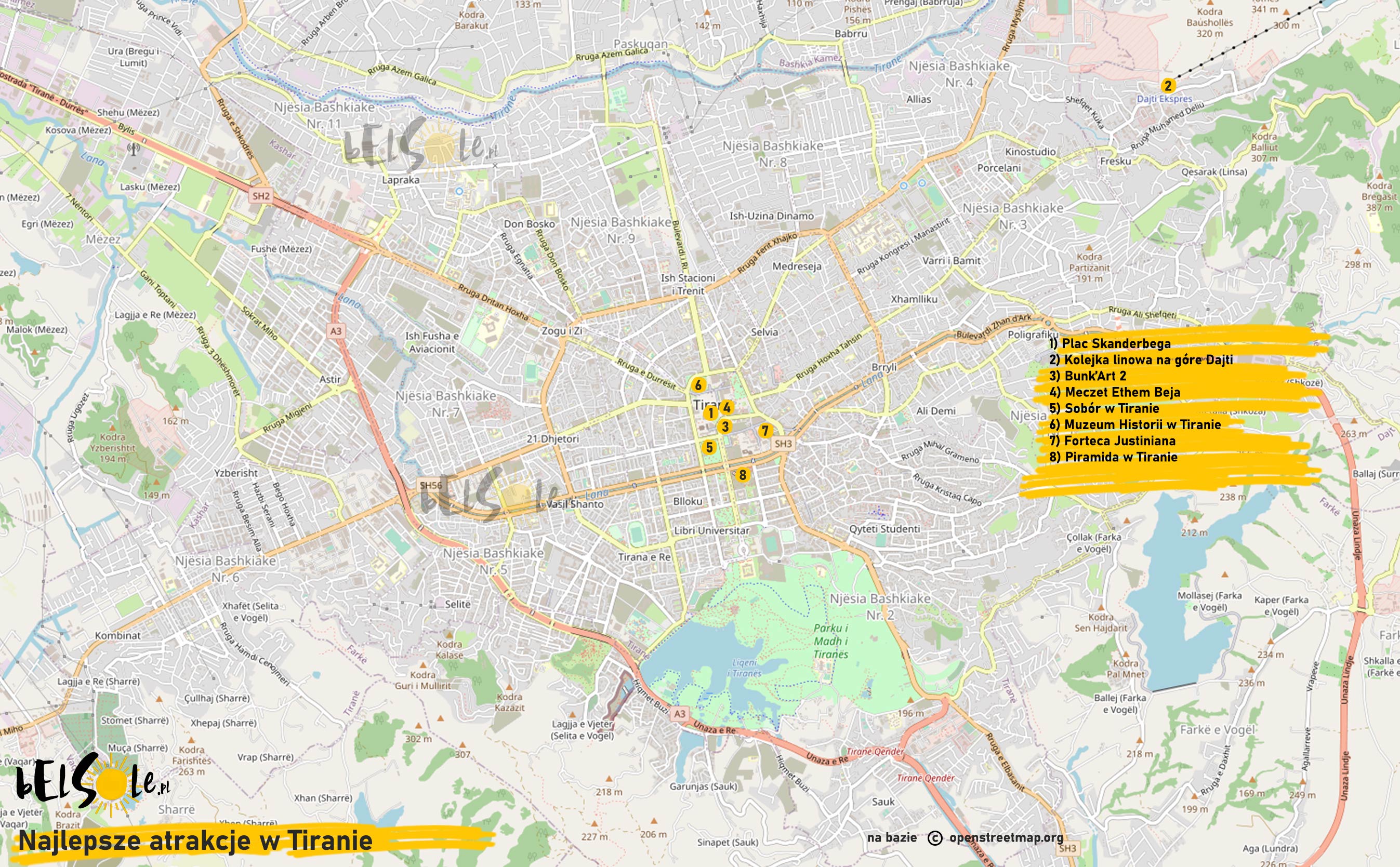 1) Plac Skanderbega 2) Kolejka linowa na góre Dajti 3) Bunk’Art 2 4) Meczet Ethem Beja 5) Sobór w Tiranie 6) Muzeum Historii w Tiranie 7) Forteca Justiniana 8) Piramida w Tiranie
