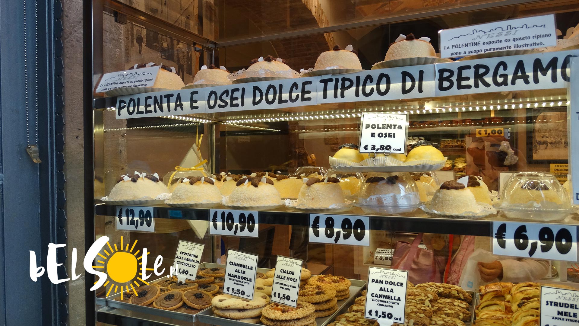 Jeśli jesteście w Bergamo to koniecznie trzeba kupić sobie tradycyjny deser produkowany właśnie w tym rejonie – Polenta e osei to zwykle deser ale istnieje też wersja słona potrawy. Głównie to jednak przekąska złożona z cukru, drożdży, jajek, kremu orzechowego i czekolady. Uformowany w formię kilki deser dekorowany malutkimi ptaszkami marcepanowymi pokryty marcepanem obsypanym cukrem. Desery formowane w kształcie kulki kupuje się na wagę w różnych rozmiarach i kształtach. Do Polski raczej nie dowieziecie chyba że na szybko wciśnięte i dobrze zabezpieczone w bagażu do samolotu.