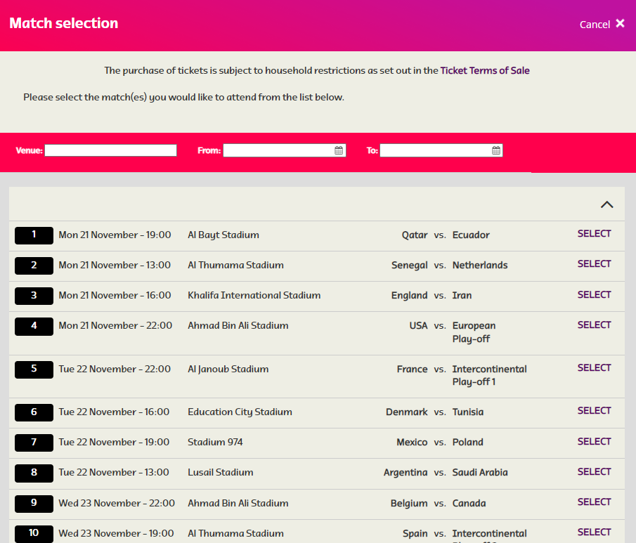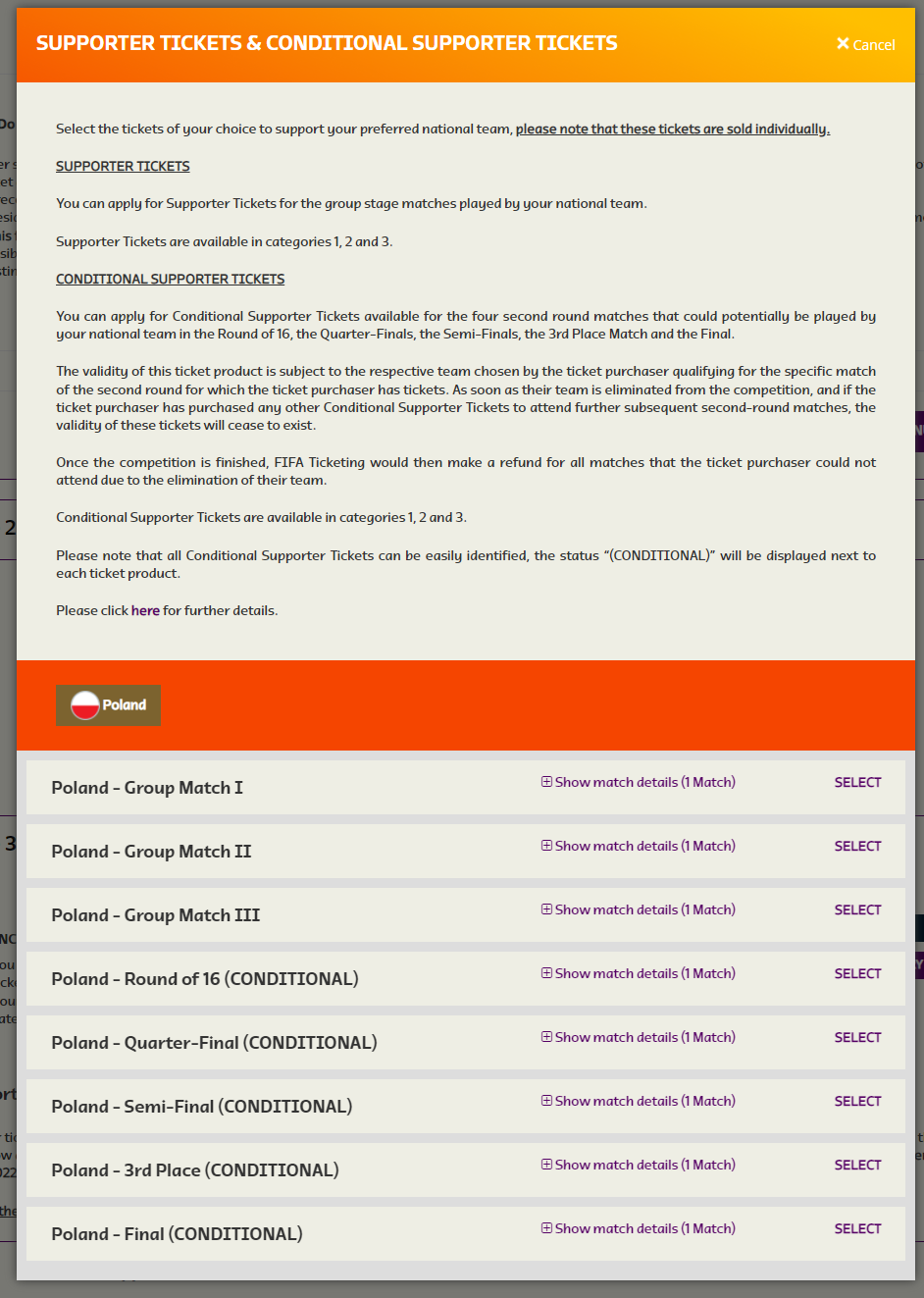 Wybór meczu dla przykładu Polski, jeśli awansuje – możecie wtedy wybrać bilet nawet na finał MŚ w Katarze w 2022