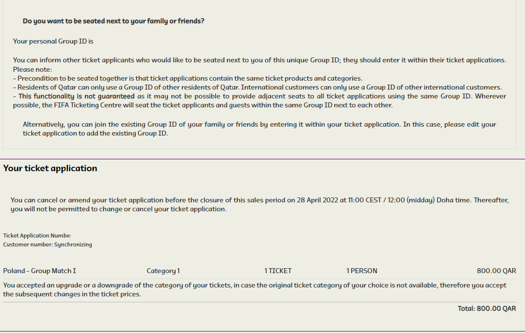 Jak widzicie, złożenie formularza o kupno biletu na MŚ w Katarze w 2022 na mecze Polaków było banalnie proste. Jeśli chcecie wiedzieć ile kosztują bilety na mecze w Katarze warto zapoznać się z poradnikiem: Ile kosztują bilety na Mistrzostwa Świata 2022 w Katarze.