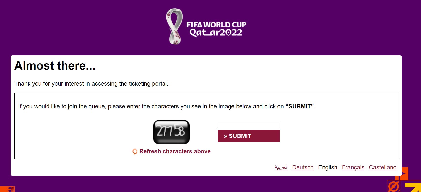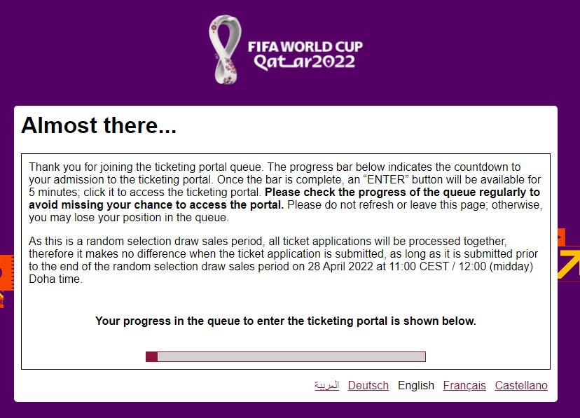 Wchodzimy na stronę https://www.fifa.com/tickets gdzie przywita nas taki ekran: