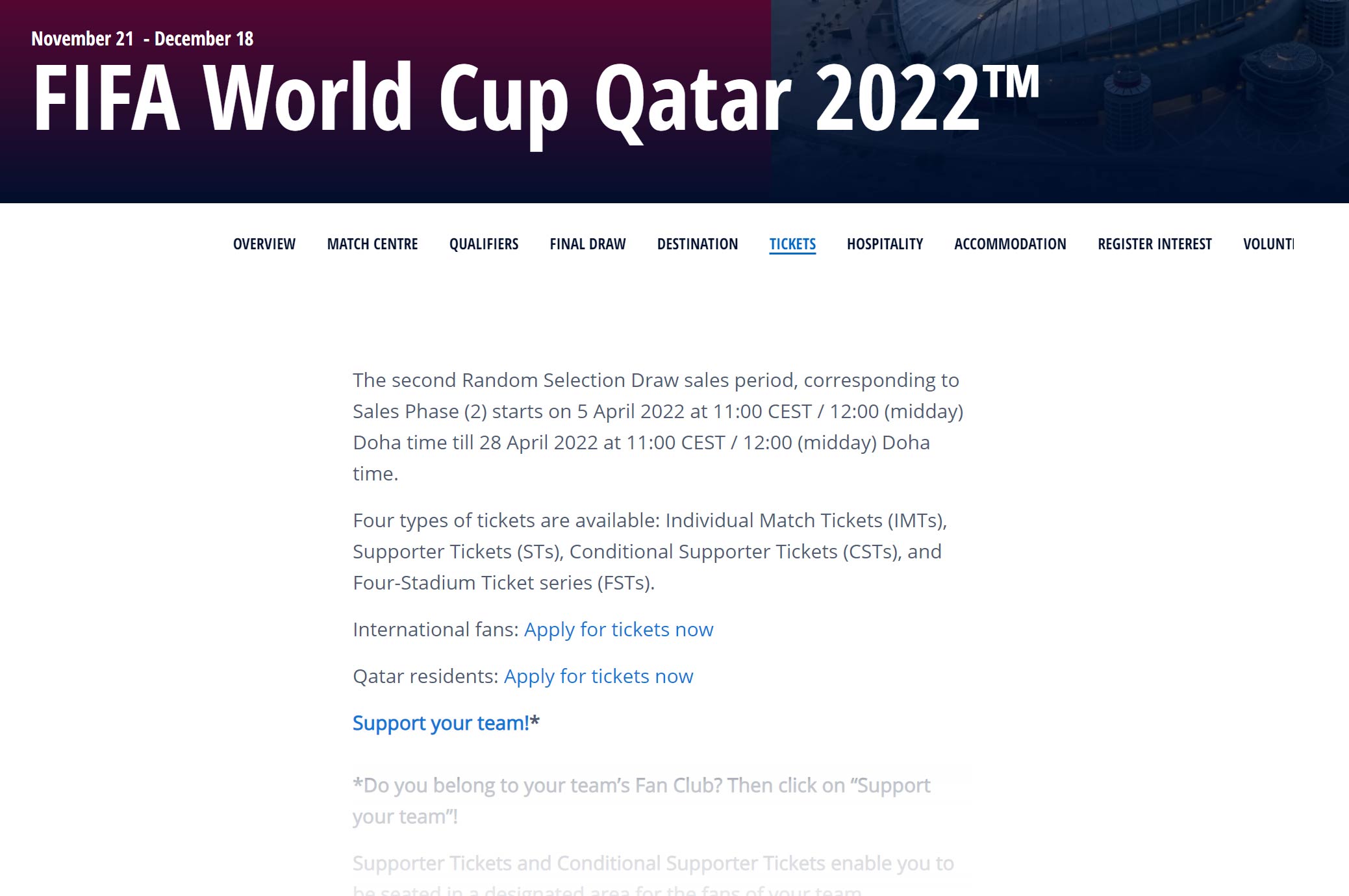 Tutaj musimy wybrać opcję dla International fans: Apply for tickets Now pozwoli to na zakup biletu dla Polaków w Katarze