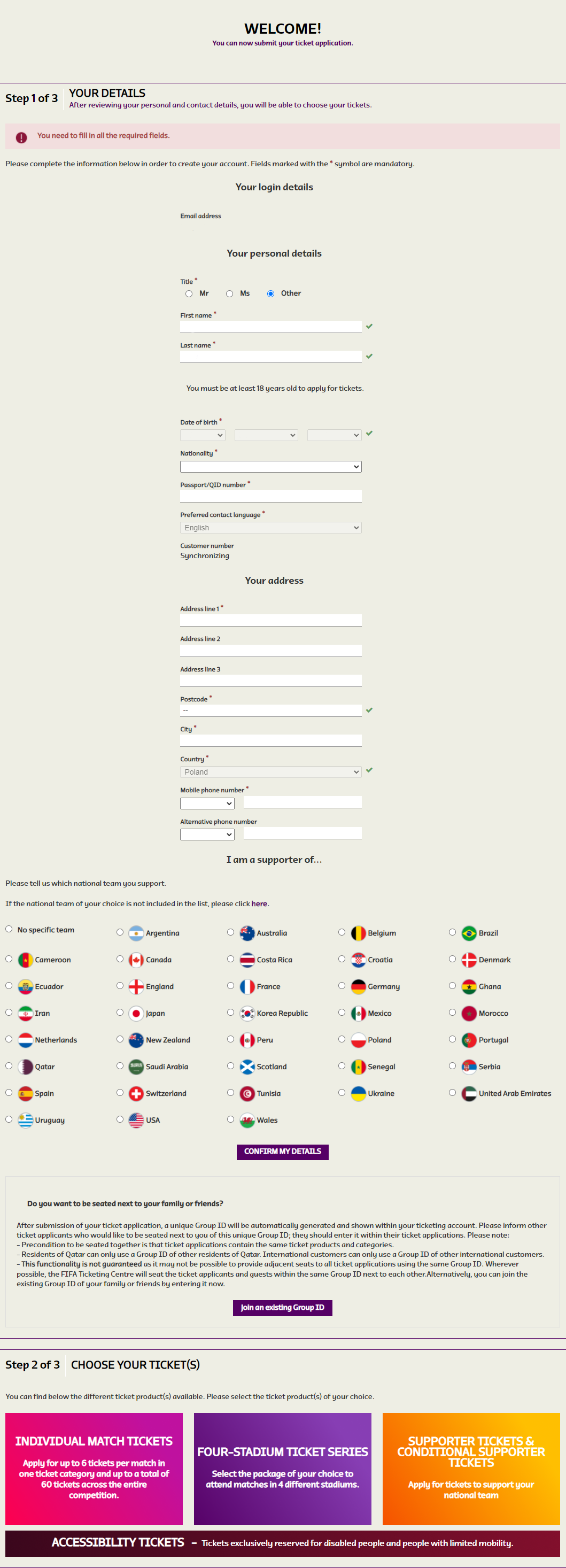 Kiedy stworzycie konto, będziecie mogli wejść do formularza aplikacyjnego gdzie można kupić bilety na Mistrzostwa Świata w Katarze 2022, co prawda nie kupić jeszcze co o nie zawnioskować.