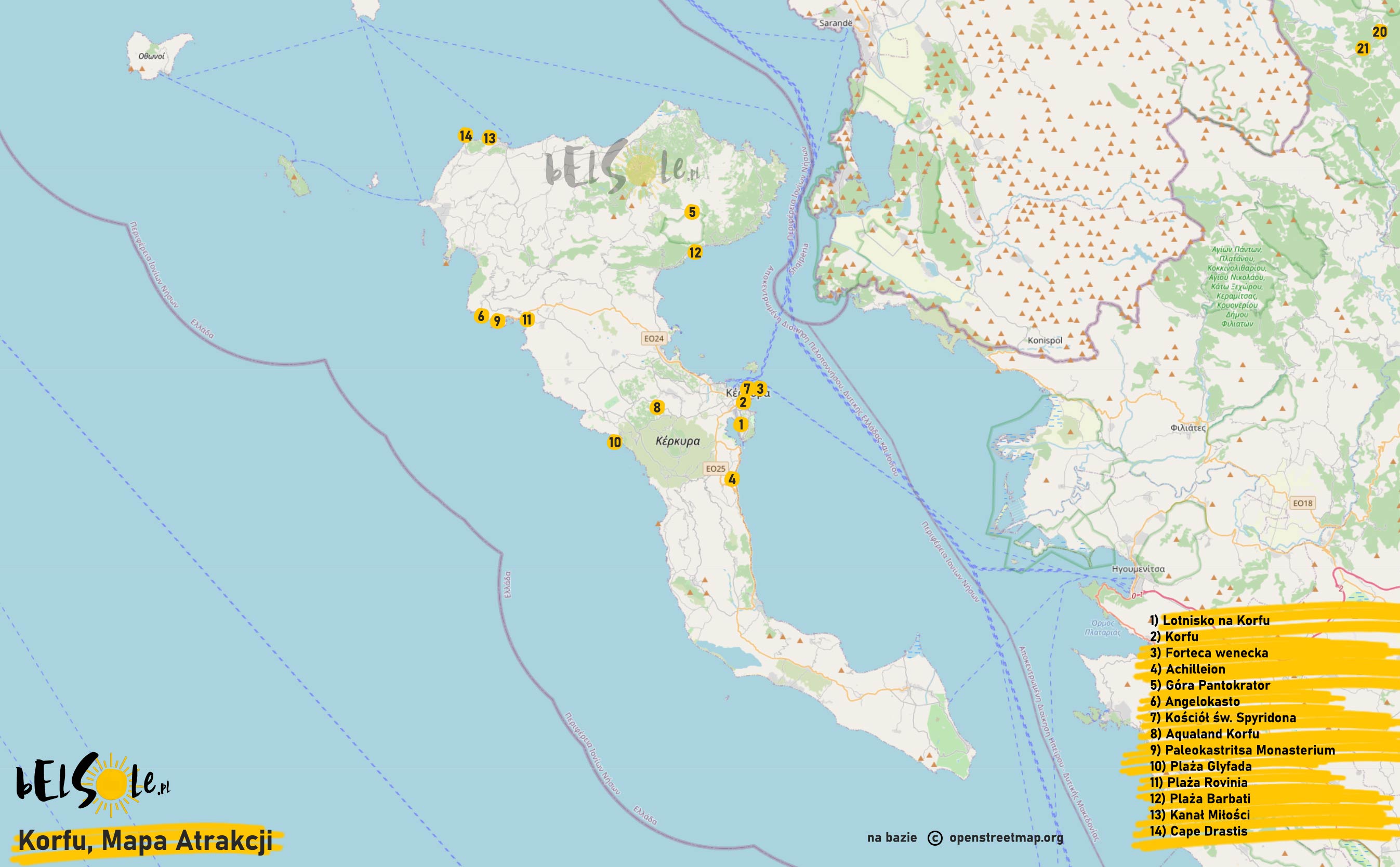 1) Lotnisko na Korfu 2) Korfu 3) Forteca wenecka 4) Achilleion 5) Góra Pantokrator 6) Angelokasto 7) Kościół św. Spyridona 8) Aqualand Korfu 9) Paleokastritsa Monasterium 10) Plaża Glyfada 11) Plaża Rovinia 12) Plaża Barbati 13) Kanał Miłości 14) Cape Drastis
