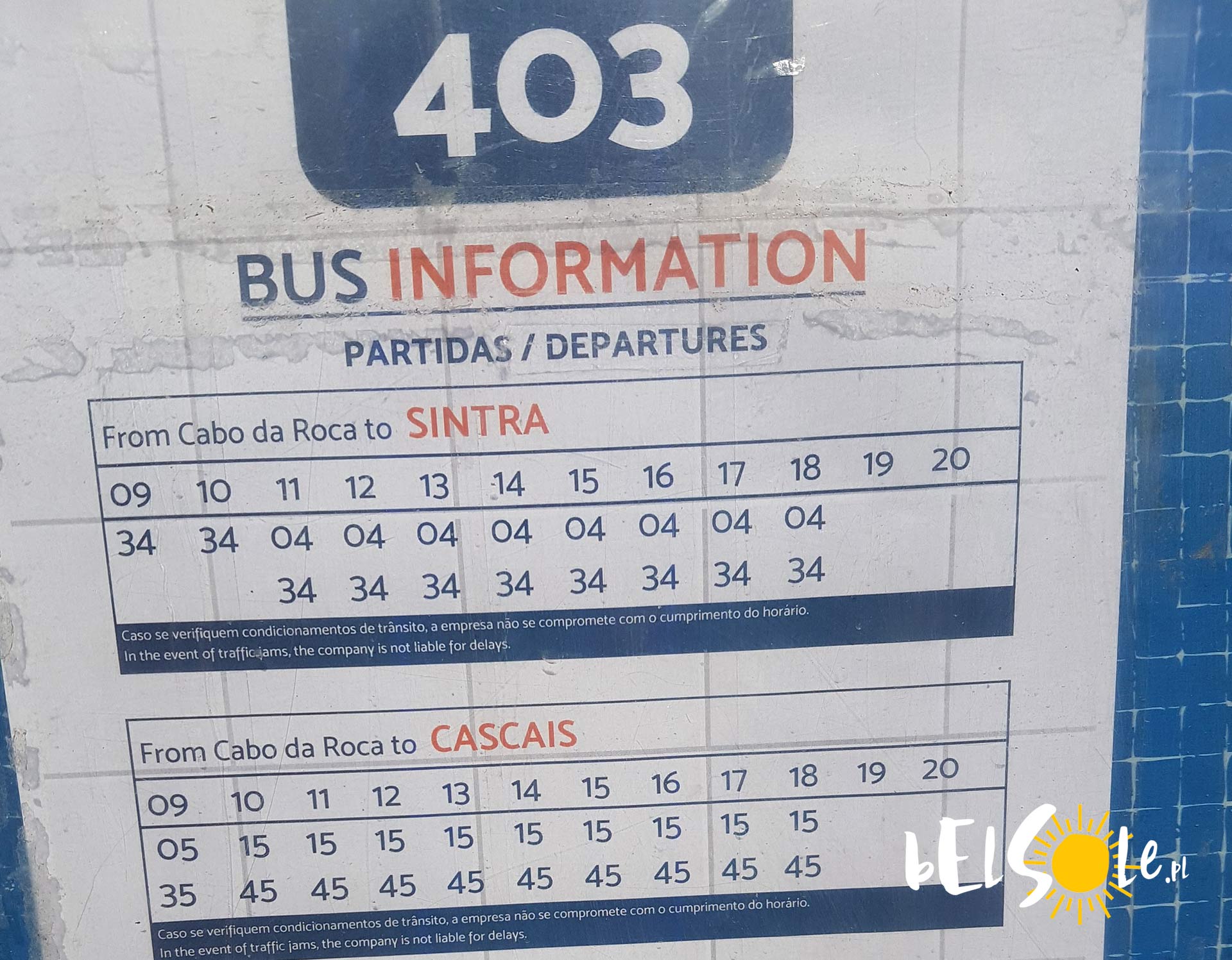 Trasa przez Sintrę na północy: Bilet na pociąg do Sintry z Lizbona Rossio kosztuje 2,25 EUR na stronie cp.pt a przejazd trwa 49min. W Sintrze wysiadamy na dworcu, zaraz obok którego są przystanki autobusowe. Należy wsiąść w autobus 403 do Cabo da Roca, autobusem jedzie się po krętych drogach 34min. Autobusy odjeżdżają co 30min a ich rozkład znajdziecie tutaj https://scotturb.com/pt/, cena to 4 EUR.