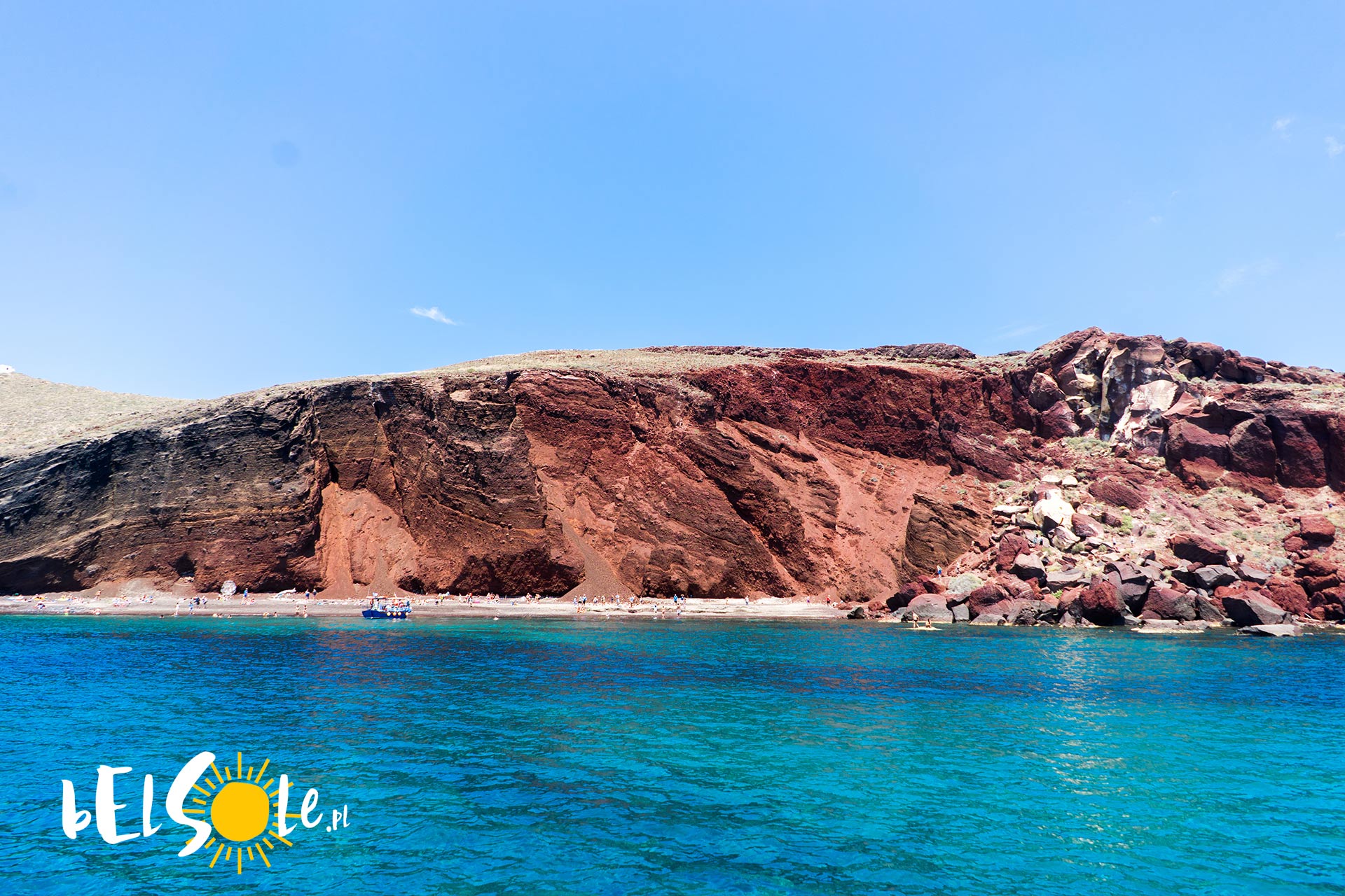 Plaża ta znana jest ze swoich czerwonych klifów przy samej plaży, samo wybrzeże jest piaszczysto-kamieniste. Co ciekawe piasek jest czerwono-czarny, ze względu na wulkaniczne skały Santorynu. Część plaży przy samych klifach jest zazwyczaj wyjęta z użytkowania przez zagrożenie od spadających skał z czerwonych klifów. Obok plaży znajduje się kawiarnia, leżaki i parasole. Idealna plaża by poczuć się jak Elon Musk na Marsie. Parking znajduje się po drugiej stronie klifu. Red Beach znajduje się 20 min jazdy na południe od Firy.