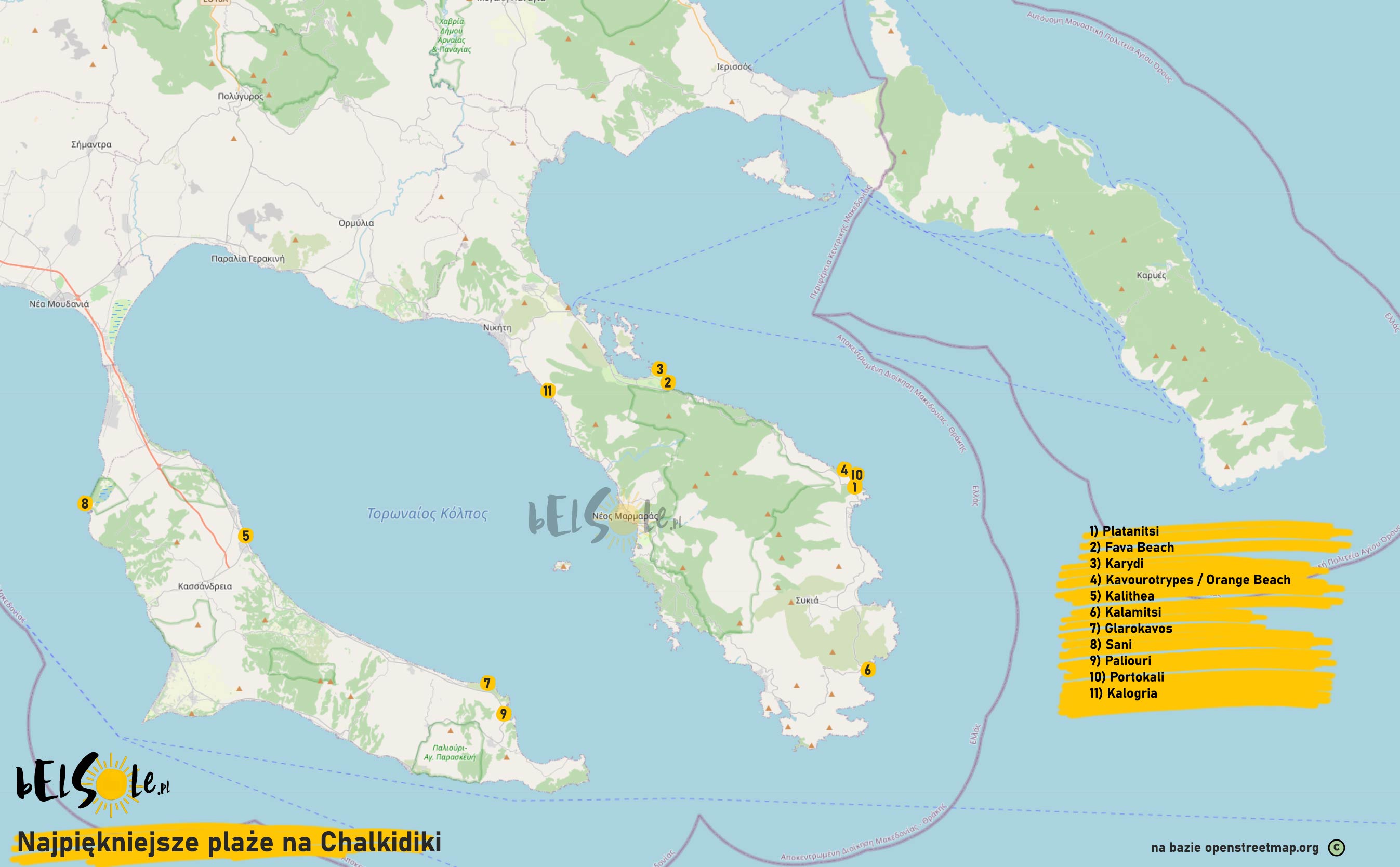 1) Platanitsi 2) Fava Beach 3) Karydi 4) Kavourotrypes / Orange Beach 5) Kalithea 6) Kalamitsi 7) Glarokavos 8) Sani 9) Paliouri 10) Portokali 11) Kalogria