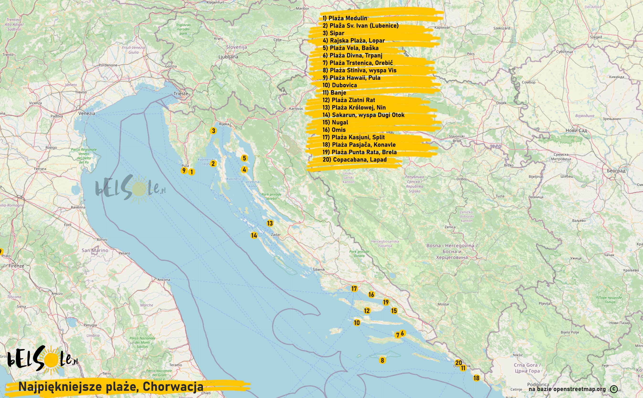 1) Plaża Medulin 2) Plaža Sv. Ivan (Lubenice) 3) Sipar 4) Rajska Plaża, Lopar 5) Plaża Vela, Baška 6) Plaża Divna, Trpanj 7) Plaża Trstenica, Orebić 8) Plaża Stiniva, wyspa Vis 9) Plaża Hawaii, Pula 10) Dubovica 11) Banje 12) Plaża Zlatni Rat 13) Plaża Królowej, Nin 14) Sakarun, wyspa Dugi Otok 15) Nugal 16) Omis 17) Plaża Kasjuni, Split 18) Plaża Pasjača, Konavle 19) Plaża Punta Rata, Brela 20) Copacabana, Lapad