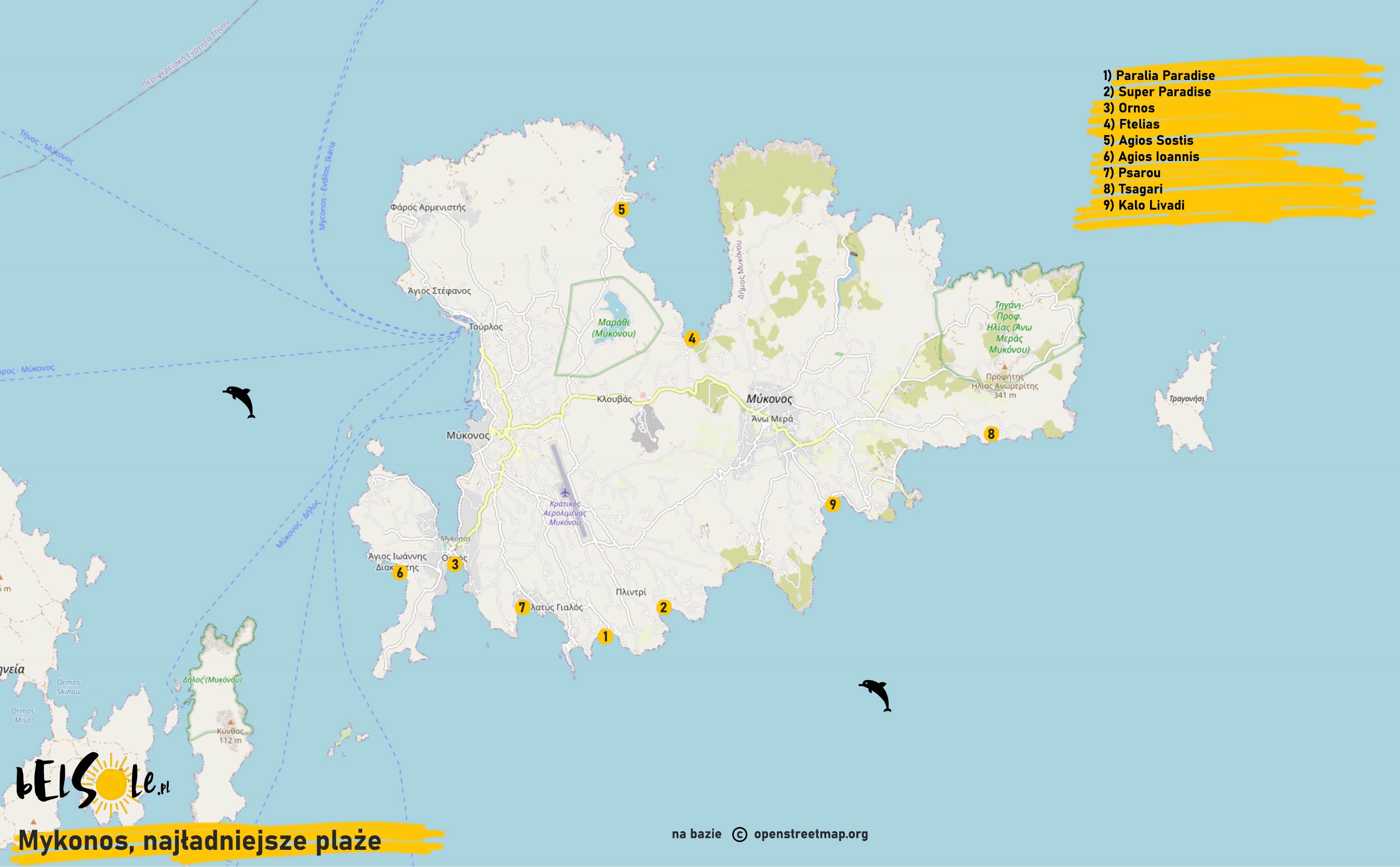 1) Paralia Paradise 2) Super Paradise 3) Ornos 4) Ftelias 5) Agios Sostis 6) Agios Ioannis 7) Psarou 8) Tsagari 9) Kalo Livadi