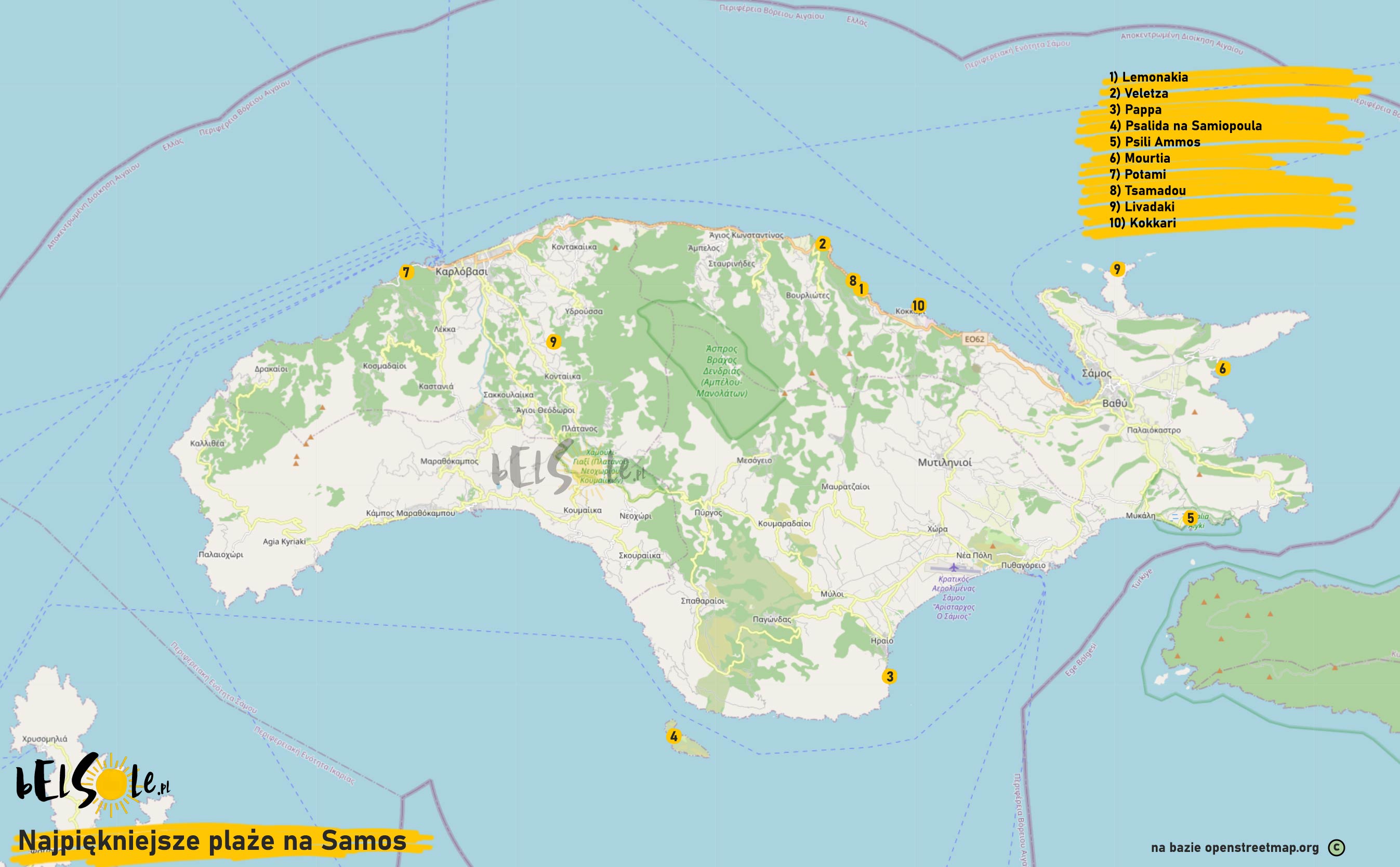 Plaże na Samos, mapa