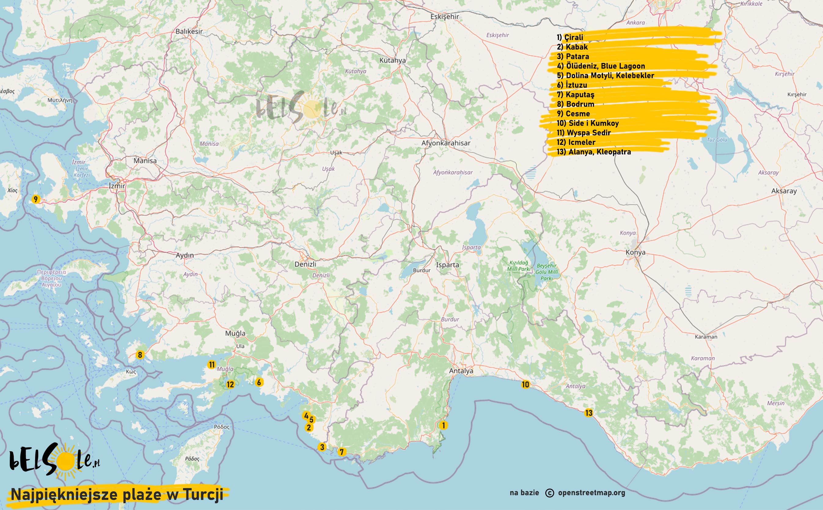 1) Çirali 2) Kabak 3) Patara 4) Ölüdeniz, Blue Lagoon 5) Dolina Motyli, Kelebekler 6) İztuzu 7) Kaputaş 8) Bodrum 9) Cesme 10) Side i Kumkoy 11) Wyspa Sedir 12) Icmeler 13) Alanya, Kleopatra