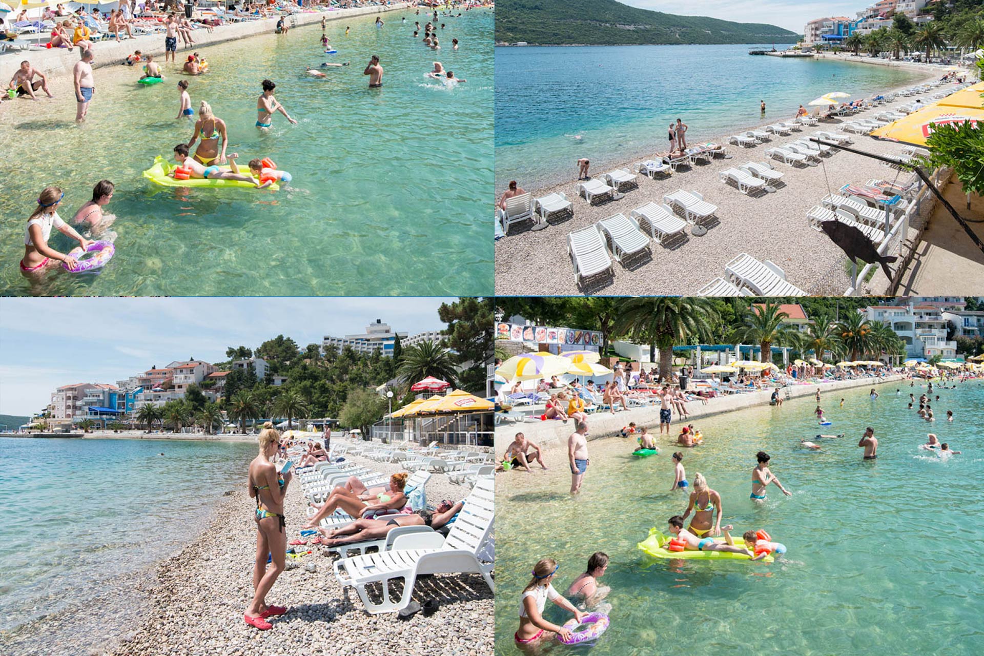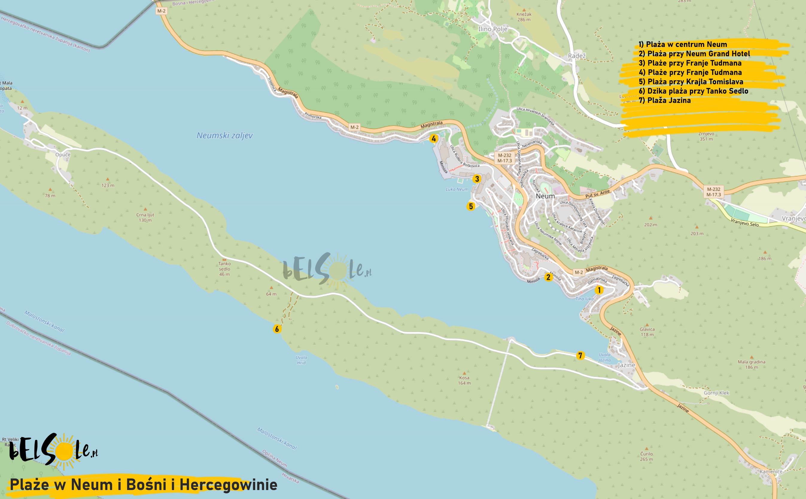 1) Plaża w centrum Neum 2) Plaża przy Neum Grand Hotel 3) Plaże przy Franje Tudmana 4) Plaże przy Franje Tudmana 5) Plaża przy Krajla Tomislava 6) Dzika plaża przy Tanko Sedlo 7) Plaža Jazina