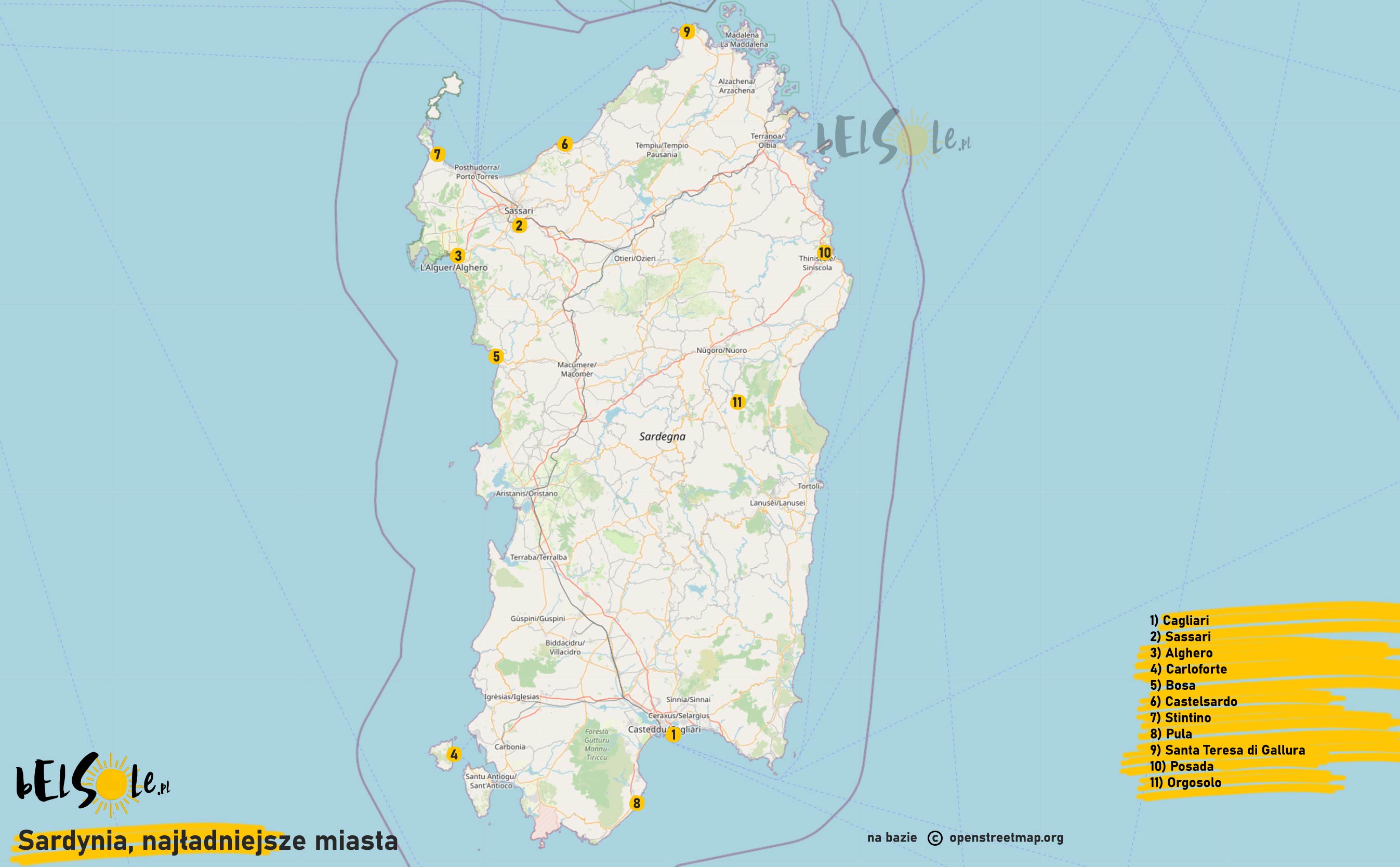 1) Cagliari 2) Sassari 3) Alghero 4) Carloforte 5) Bosa 6) Castelsardo 7) Stintino 8) Pula 9) Santa Teresa di Gallura 10) Posada 11) Orgosolo