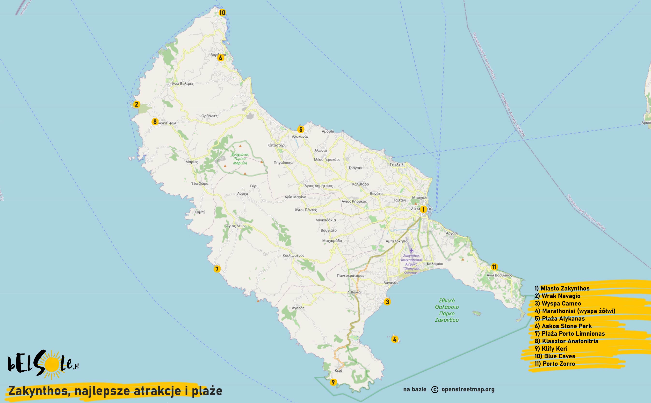 1) Miasto Zakynthos 2) Wrak Navagio 3) Wyspa Cameo 4) Marathonisi (wyspa żółwi) 5) Plaża Alykanas 6) Askos Stone Park 7) Plaża Porto Limnionas 8) Klasztor Anafonitria 9) Klify Keri 10) Blue Caves 11) Porto Zorro